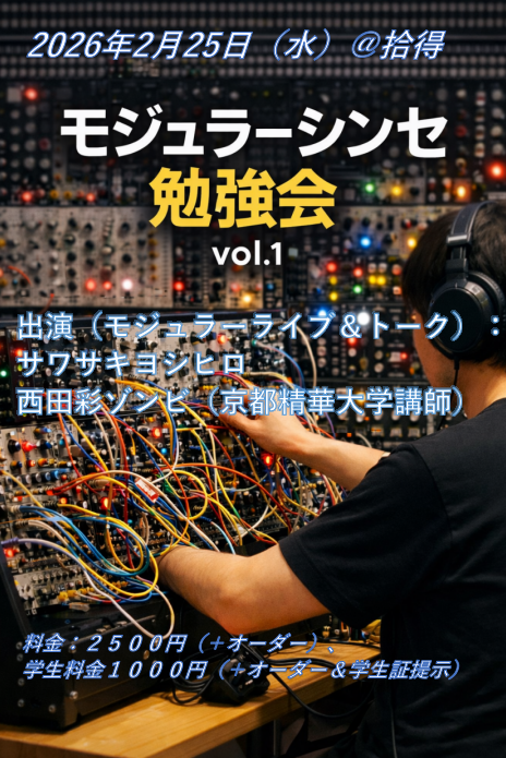 そんなモジュラーシンセサイザーとは、果たしてどういうものなのか、拾得に集うお客様やアーチストの間で、興味を持たれてる方が多いくいらっしゃるということですので、その可能性を紐解いて行き、まさに勉強会的イベントを開催していければと思っております。